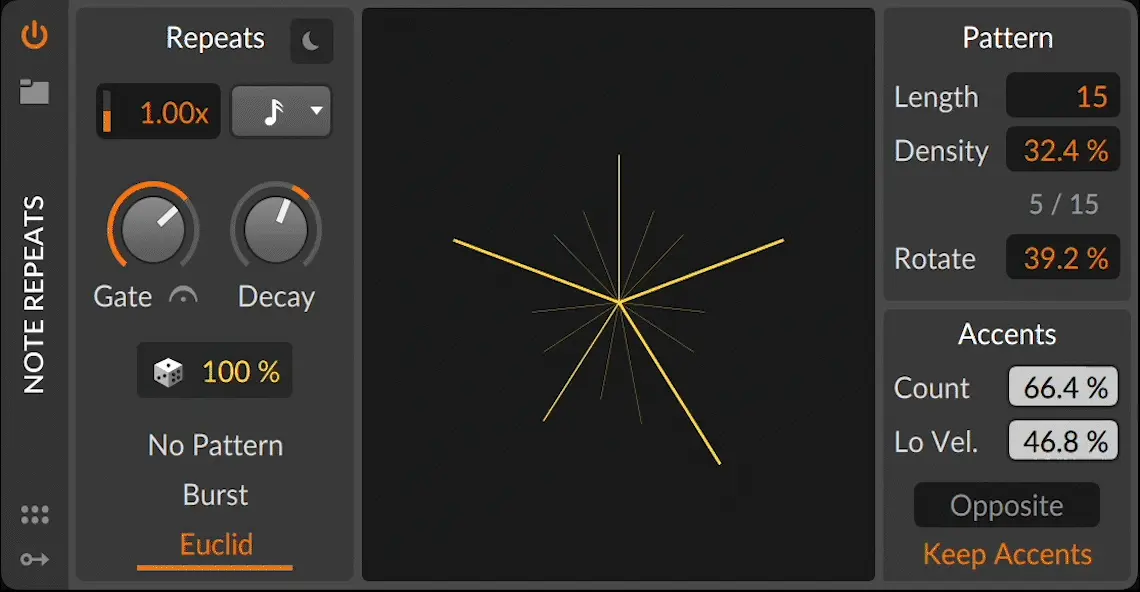 Note Repeats retriggers each note, with additional “Burst” and “Euclid” pattern modes.
