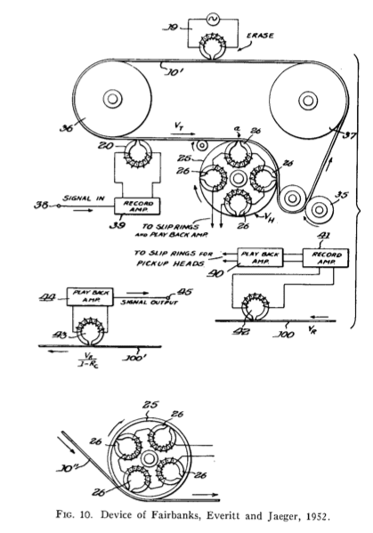 | Say you mounted four [heads] on a small upright cylinder, and could rotate this "drum" in either direction at any speed. Before the tape begins to move those heads could repeatedly "scan" a short section of audio track and unendingly play the sound at that one spot. Start the tape moving, keep spining the heads against the direction of the tape's motion. The relative head-to-tape speed would now be faster than normal, shifting the pitch of the audio upwards. But the length of tape would take the same amount of time to play. Which some audio people pointed out would give us a nice way to increase the pitch of a recording, without changing its duration! Instead rotate the head drum in the opposite direction, so the gaps move with the flow of the tape, as if trying to catch up with it, like cars passing on a highway move apart rather slowly. The relative head to tape speed in this case would be slower than normal. Yet again, the same length of tape would take the usual amount of time to playback. Result: you'd decrease the pitch of a recording, without changing its duration. Simple and clever, no? Finally, let's install a small differential gearing to couple the capstan (which drives the tape) to the rotation of the head drum. If you did it correctly, you could maintain a constant head-to-tape speed, no matter how slow or fast the tape itself moved. You'd have a practical way to alter the duration of a recording, without altering its pitch (i.e., time compression / expansion). |