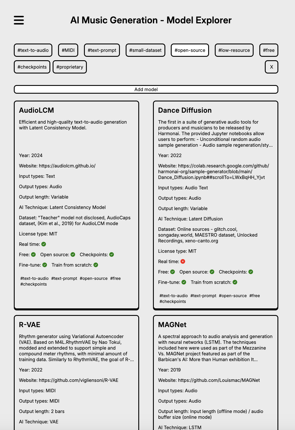 It aims to promote low-resource AI models and link to open-access, non-profit archival repositories and AI models which are mostly excluded from other listings. The filtering options and features of AI models captured in the repository are focussed on features of AI models that support innovation in music making and challenge existing dominant deep-learning models. This repository supports open and editable lists of AI models, their training datasets, possibility of fine-tuning and control, licensing, and input and output types. The collection can be filtered by these properties, helping identify models which could be trained from scratch or fine-tuned on small datasets.