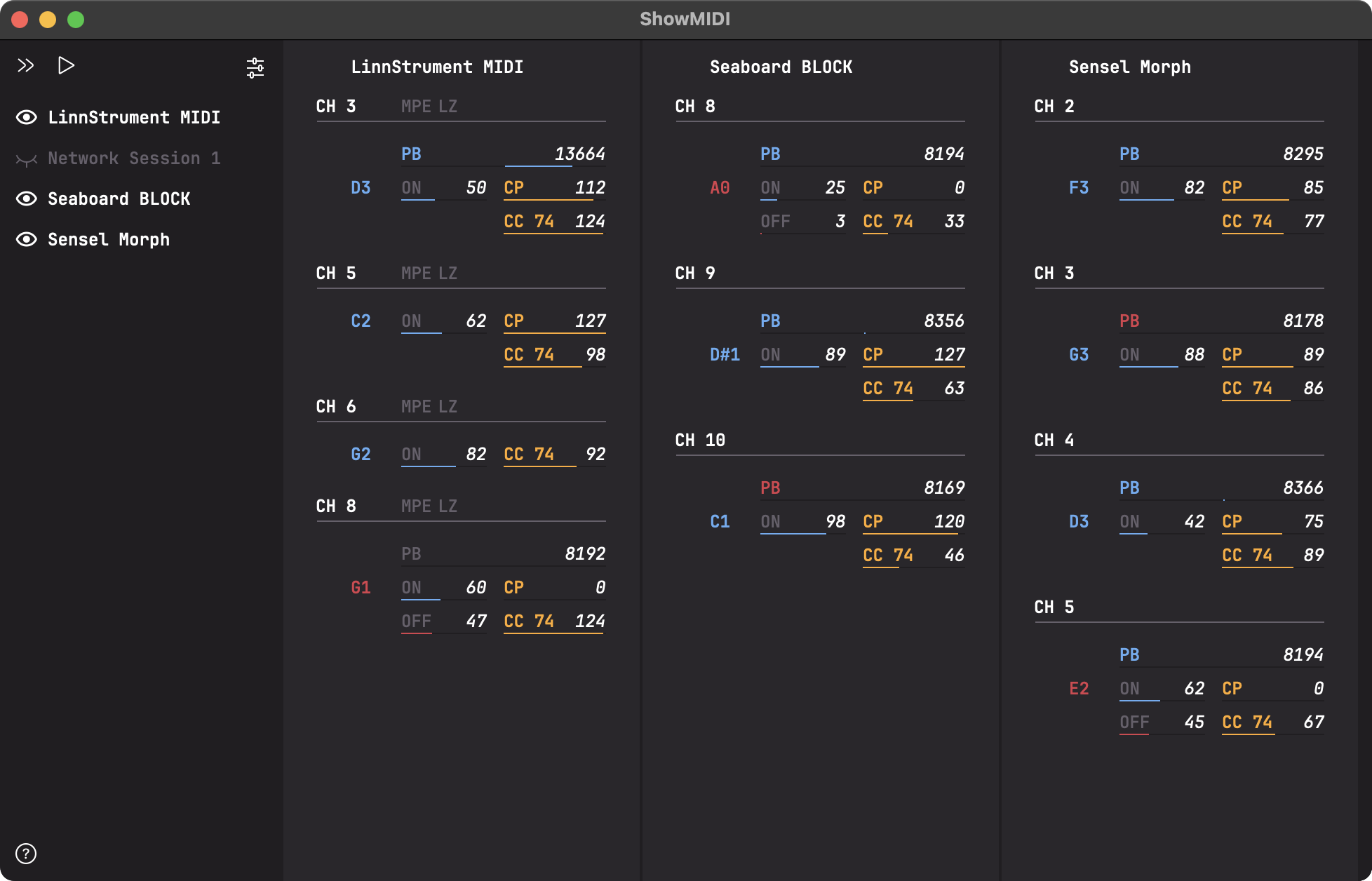 ShowMIDI is designed for immediate display of MIDI messages without having to wade through logs. For decades we’ve assumed that MIDI loggers are how to deal with MIDI data streams. ShowMIDI instead organizes everything in hierarchical buckets, and automatically presents them in the way that matters to you as a human. You can leave ShowMIDI running while using any MIDI product and at a glance you’ll always see the messages that are pertinent to you at that time. Wading through MIDI messages in a log is almost never necessary anymore.