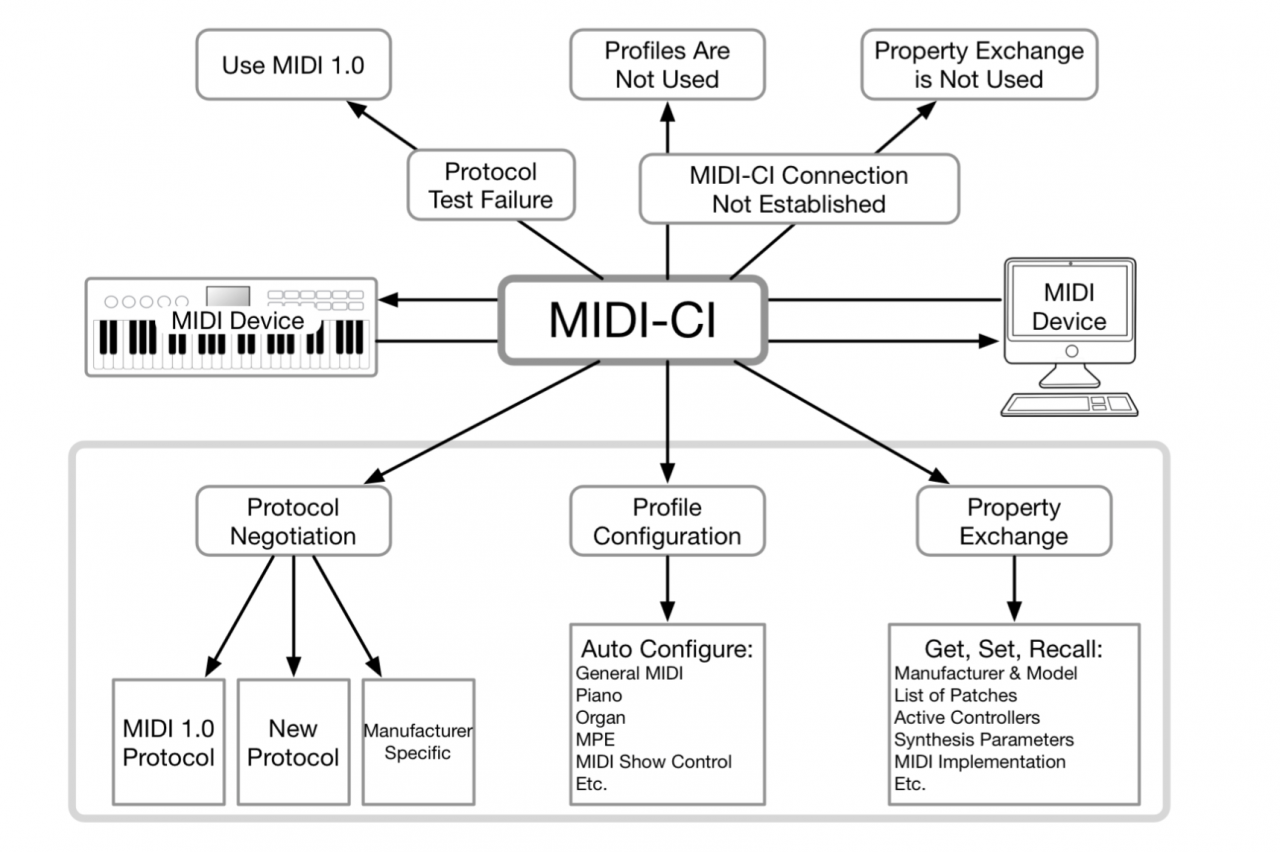 The final part of MIDI-CI is Protocol Negotiation. This defines how to start in MIDI 1.0 and negotiate to a new protocol. So MIDI-CI clarifies how MIDI 1.0 devices and next-generation devices can live together in one system.