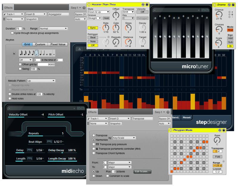 If your host has a Transpose MIDI plug-in, it might do a lot more than audio transposition plug-ins—like transpose by intervals or diatonically, change scales in the process of transposing from one key to another, or create custom transposition maps that can map notes to drums. The image above shows a variety of MIDI plug-ins; clockwise from upper left is the Digital Performer arpeggiator, Live arpeggiator, Cubase microtuner, Live randomizer, Cubase step sequencer, Live scale constrainer, Digital Performer Transposer, Cubase MIDI Echo.