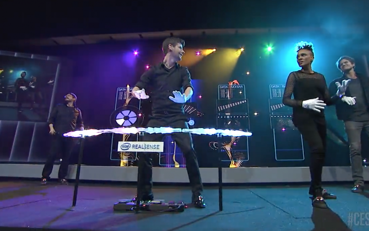 Using Intel’s Intel® RealSense™ Technology, a band performed without any physical instruments using only sensing technology to trigger MIDI notes and contoller data. Musical Director Kevin Doucette performed on what is affectionately known as “the Dragon Fly” which can use positional sensing to send different MIDI CC messages.