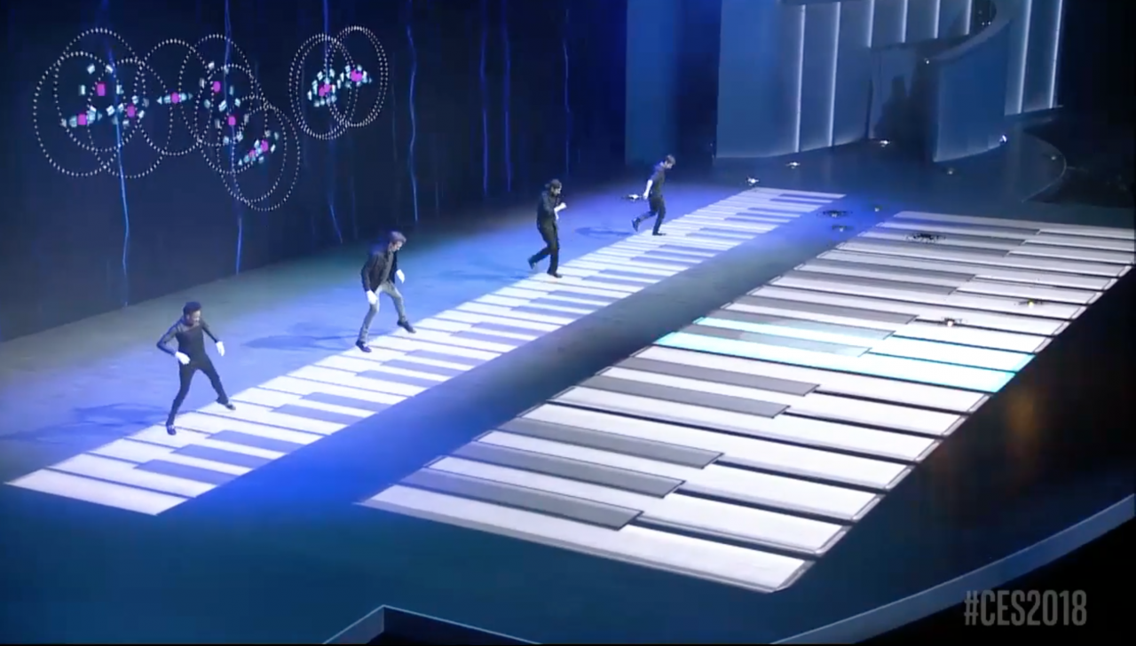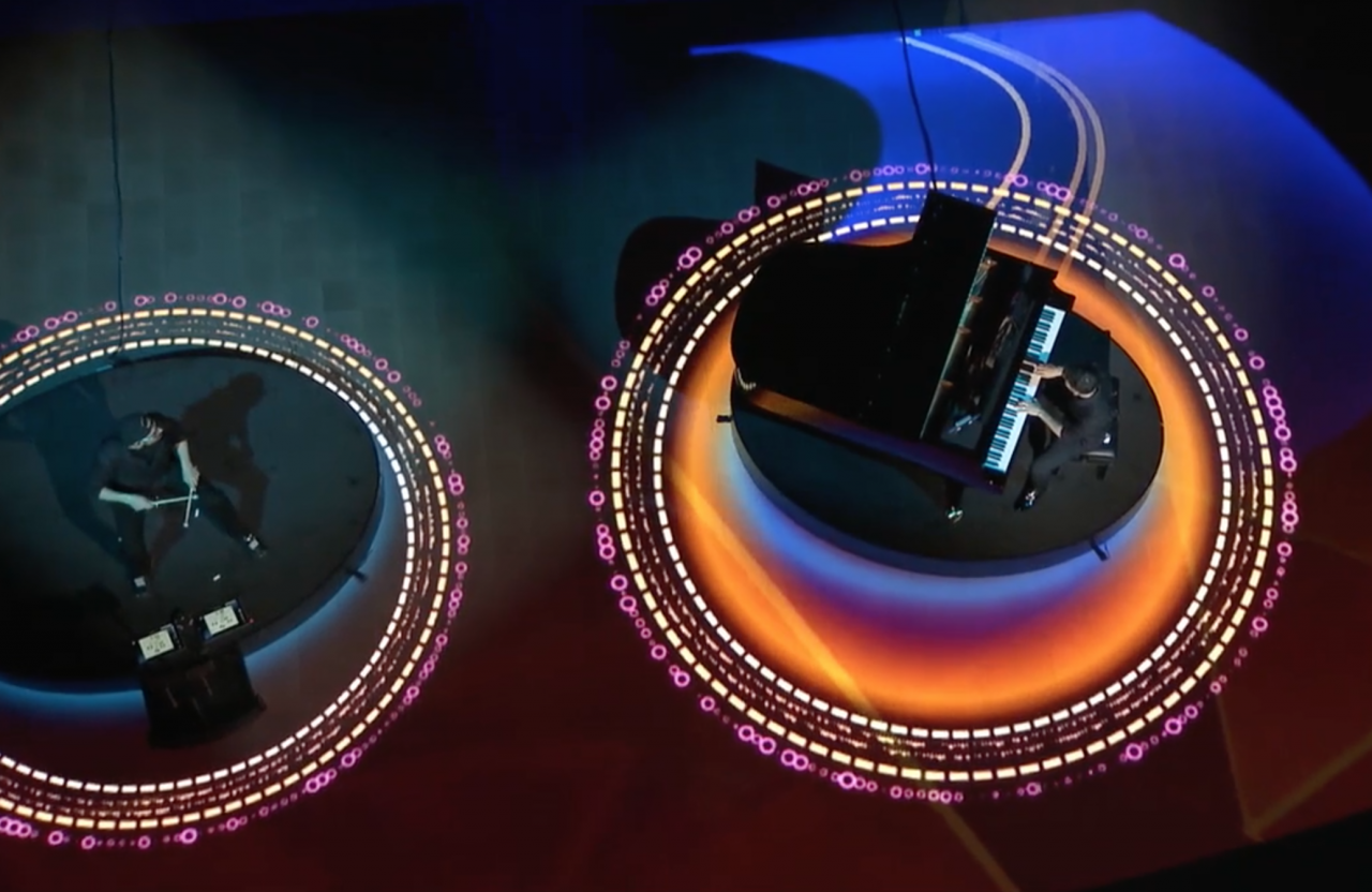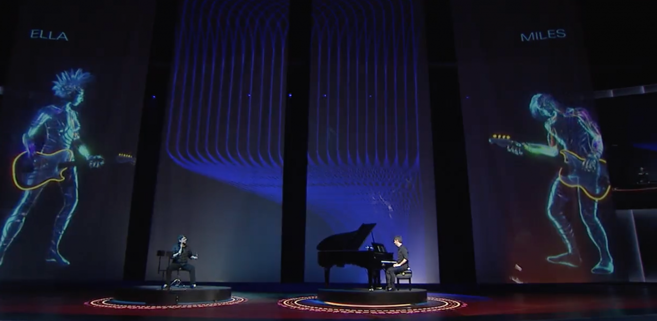 Kevin played a Yamaha DCF4 Disklavier sending MIDI data in real time to an Intel Movidius Neural Compute Stick™ where AI algorithms processed the data and created new MIDI notes that were played by two 80 ft. tall avatars named Ella and Miles.