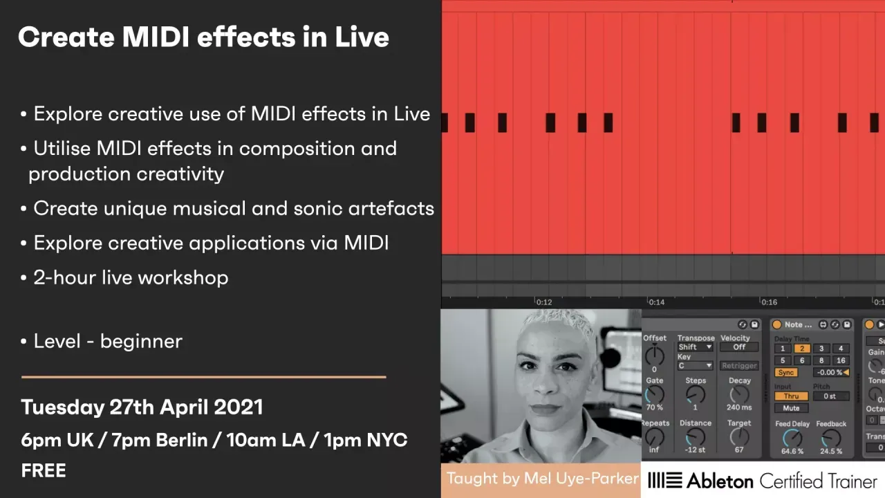 Ableton Live offers a vast playground of musical opportunities to create musical compositions and productions. Live’s native MIDI FX provides a range of tools to allow the composer and producer to create ideas in a myriad of ways. Max For Live complements these tools and expands musical possibilities. In this workshop you will creatively explore and deploy a range of MIDI FX in a musical setting. This workshop aims to provide you with suitable skills to utilise the creative possibilities of MIDI FX in the Ableton Live environment.