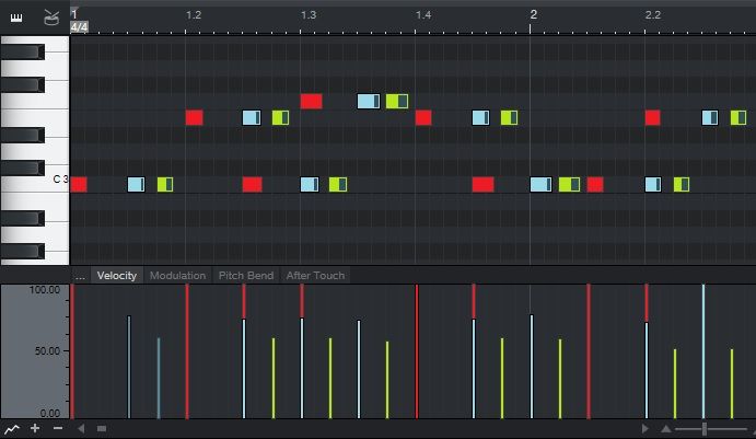 It’s simple to create MIDI echo: Copy your MIDI track, and then drag the notes for the desired amount of delay compared to the original track. Repeat for as many echoes as you want, then bounce all the parts together (or not, if you think you’ll want to edit the parts further). In the screen shot above, the notes colored red are the original MIDI part, the blue notes are delayed by an eighth note, and the green notes are delayed by a dotted-eighth note. The associated note velocities have also been colored to show the velocity changes for the different echoes.