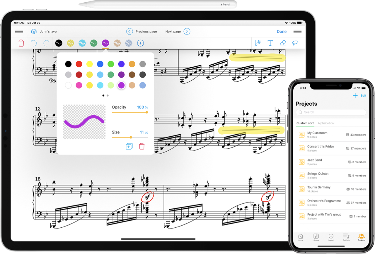 Transpose it, play it faster or slower, turn off your part and play along with the accompaniment only, share it in real time with colleagues and friends working on the same piece wherever they are, enrich it with annotations, audio and video files – enjoy a living, dynamic partner instead of dry and dusty notes on paper.