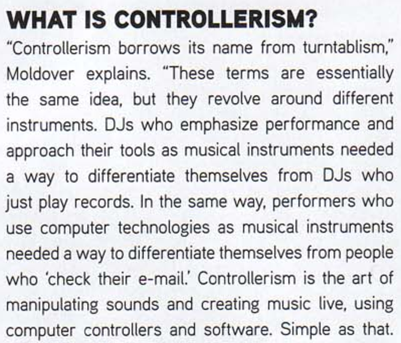 In 2005, Matt Moldover and Dj Shakey (Julie Covello) coined the term “Controllerism” to describe Moldover’s performance style. Ean Golden from Remix Magazine (now running djtechtools) wrote an article “Music Maneuvers: Discover the Digital Turntablism Concept, Controllerism, Compliments of Moldover” in the October 2007 issue of Remix Magazine. This helped Moldover found a whole musical movement and create Controllerism.com. Of course, Moldover uses MIDI as the control language so without MIDI controllers, there is no controllerism.