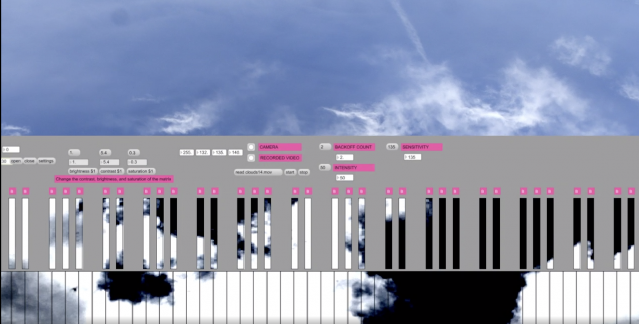 He went further and mapped multiple different video attributes to MIDI parameters. Tempo and rhythm are naturally related to how quickly the clouds are moving. Dynamics are controlled by how brightness, the more white in the video, the louder the sounds are played by generating higher MIDI velocities. Even the overall feeling of the music is based on the video input. Clouds moving in one direction are processed to have a major feel, Clouds moving the in opposite direction are processed with more minor tonalities.