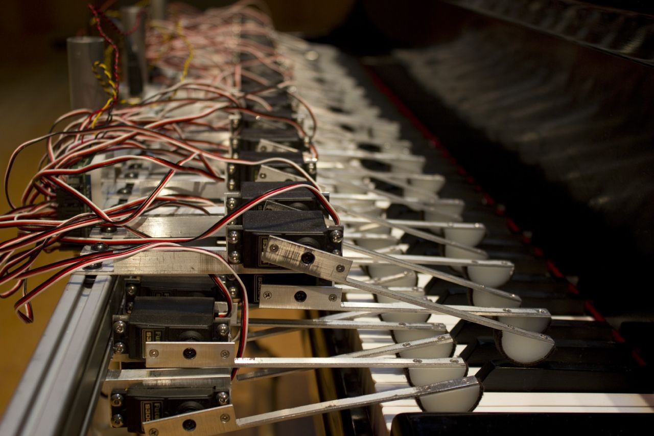 in this installation, Bowen used Max MSP and mapped Video to MIDI so that whenever a cloud passes over a note on the keyboard, the MIDI controller robotic arms presses the keys on an acoustic piano for the duration the clouds are over them. If there’s more white than blue detected, the key is pressed.