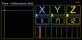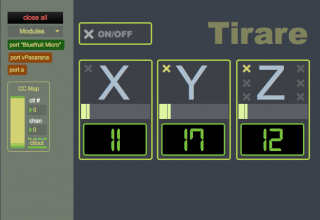My software is very simple. I use the view on the left (below) to initialize the Tirare and turn on the three axes. I use the view on the right (below) during performance to monitor the values from each axis and to monitor where the string values are in relation to the triggers I set up for controlling notes, expression, and control for Kyma.