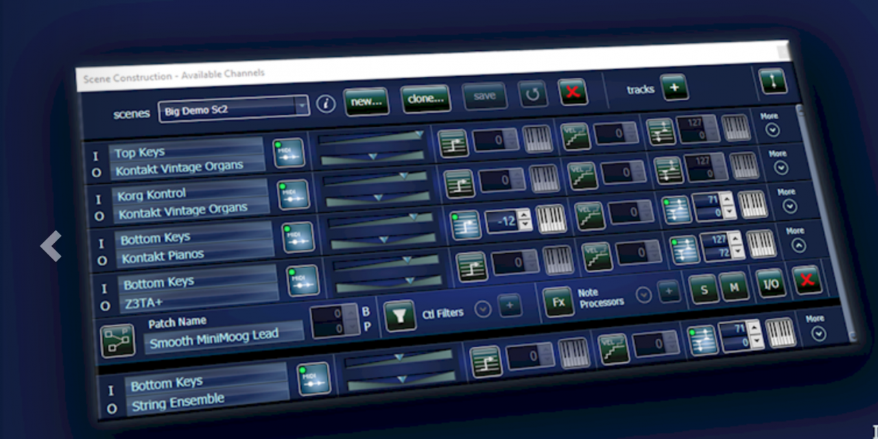 Now stop and think about that for a moment. You now have an app that can create layers, splits, transpositions and other useful functions using ALL your synths. These magic scenes or combis that you could only create within the confines of a single instrument can now be created using sounds from any and all of your stage synths. You are no longer confined to do this from a single instrument. It is now possible as an example to split an 88 note keyboard into three sections, one with a piano coming from a physical synth or say Spectrasonics’ Keyscape on the computer, another with a B3 coming from an emulator box, and the third section with a layer of horns from another channel on the first physical synth and string from a Kontakt sampler in your computer. And you can call up such scenes on the fly without any delays or glitches because Midi~Kuper makes sure that the transitions between scenes are handled seamlessly.