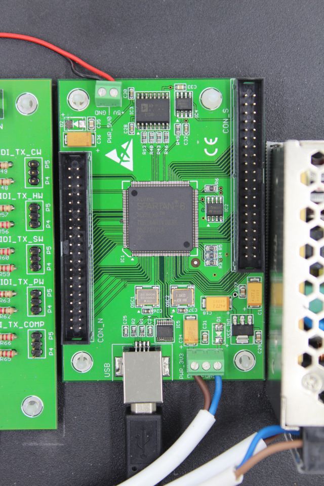 The VOCU is a completely custom design. The core processing component is based on a field programmable gate array chip. We avoided the usage of microcontrollers or platform modules to get clock-cycle-accurate control over timing and physical resources of the chip. We had to cut latency and synchronize data transmission from different MIDI queues. Standard devices usually do not have enough number of UARTs for MIDI interfaces or free pins to control push buttons and LEDs.