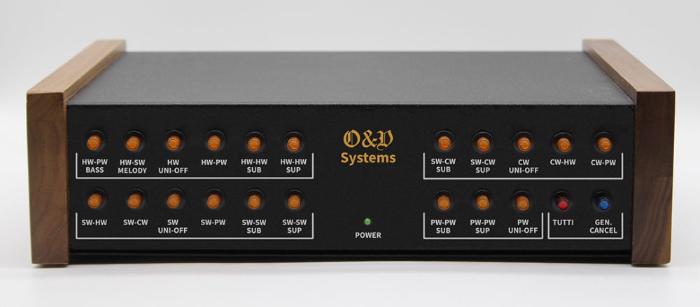 The presented device is a four-manual organ console controller. It supports Great (HW), Choir (CW), Swell (SW) and Pedal (PW) divisions. Push buttons toggle functions, usually available in every pipe or digital organ. They are octave couplers, unison off, tutti, bass, melody, manual couplers, and general cancel. There are, of course, other features demonstrated on the videos later on.