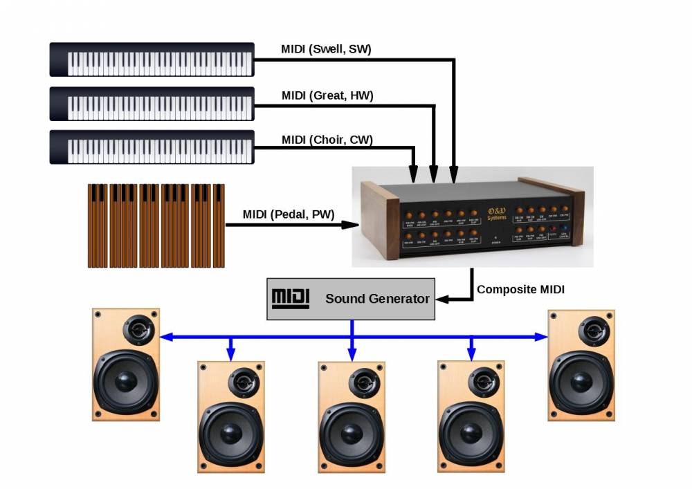 The unit has MIDI input/output pairs. Connect your instruments to inputs to control dedicated division. For example, piano controls Great division and other keyboards control Swell and Choir. You may connect divisional outputs to separate sound generators or other MIDI instruments.