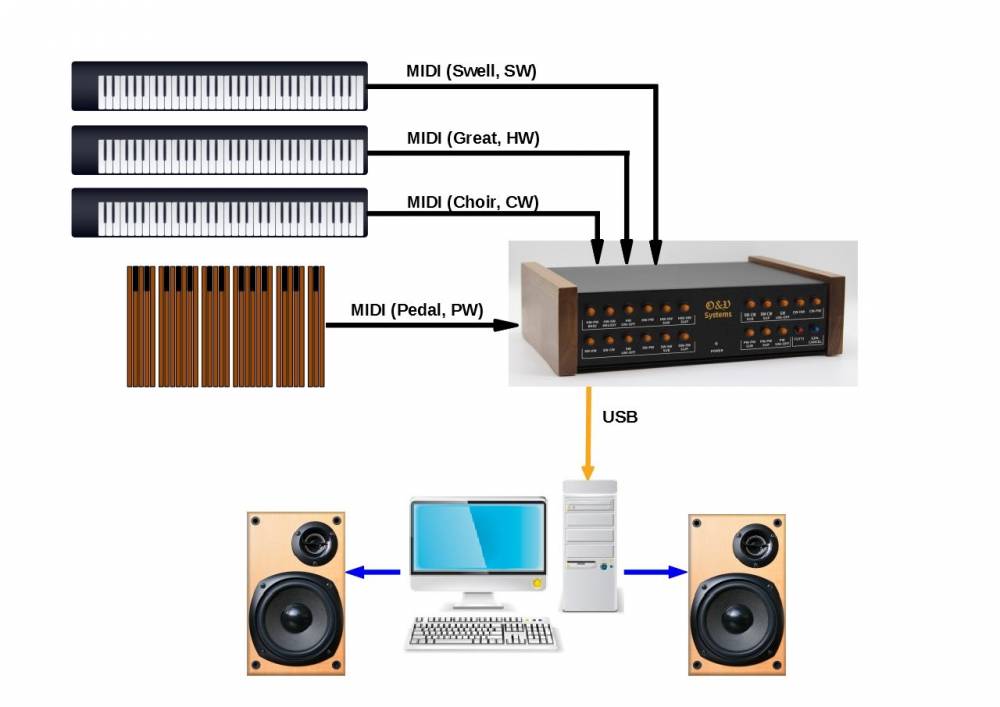 Virtual organ console unit extends a set of MIDI instruments. It brings pipe organ functions to them maintaining their natural behaviour. The VOCU adds organ principle to home, studio and stage equipment.